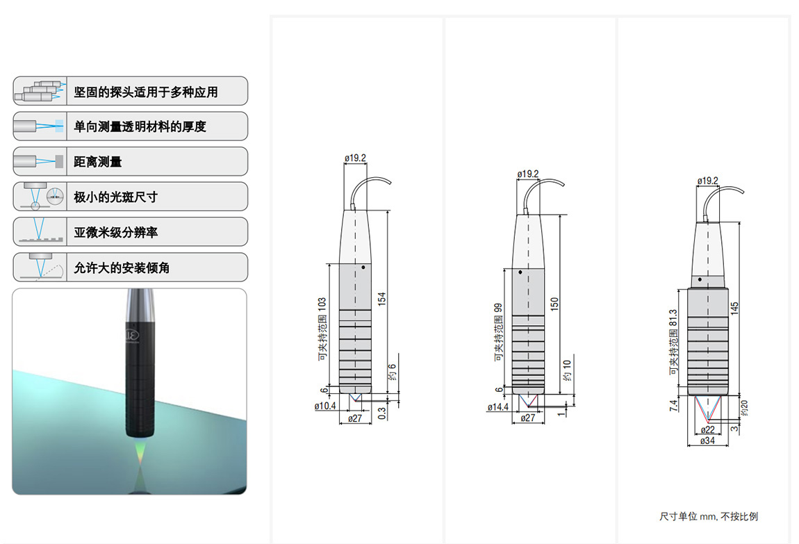 IFS2405系列光譜共焦式傳感器是專(zhuān)門(mén)為高精度要求的測量任務(wù)而設計的。該系列擁有極高的敏感度,較大的安裝傾角和安裝距離,使它可用于多種應用場(chǎng)合。除了反光與透明表面的距離測量以外,該傳感器還可以用于單向測量清潔薄膜,板材或多層結構的厚度。